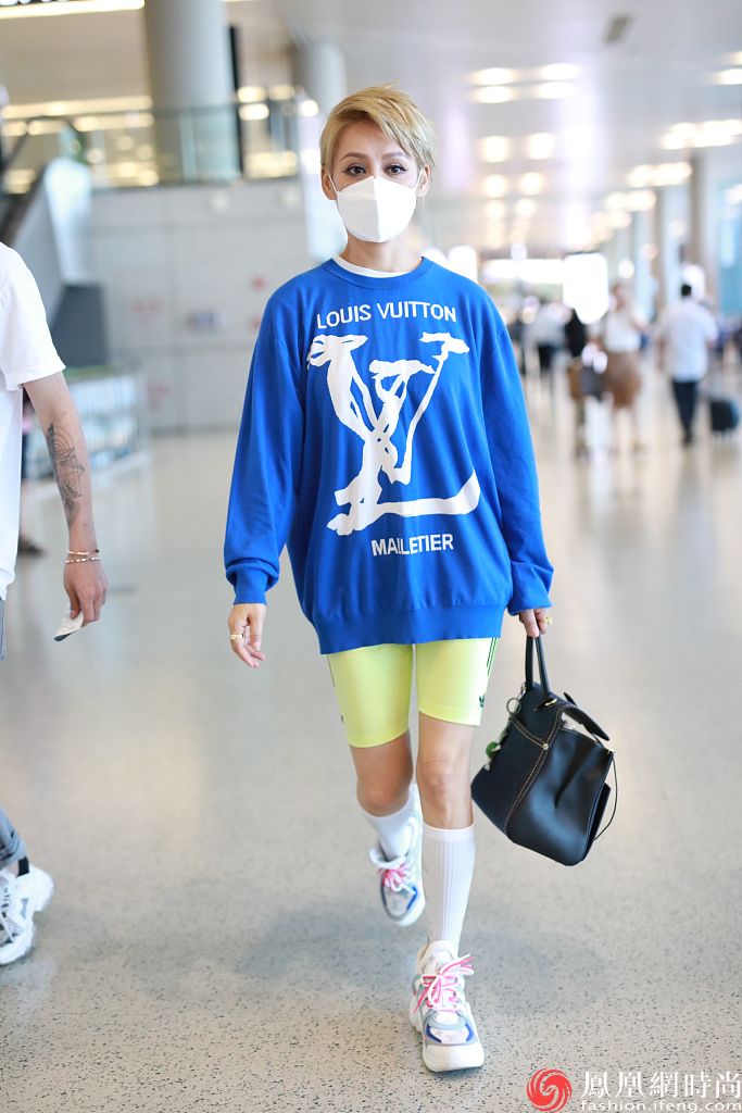 2020年8月17日,宁静亮相上海机场,她身穿LV蓝色卫衣,搭配荧光黄骑行短裤,玩转活力假小子风。
