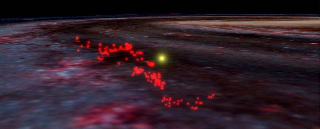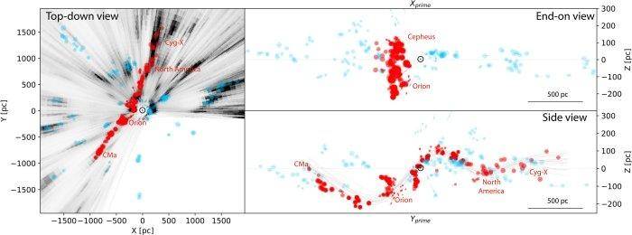 不过,当研究人员仔细查看数据时,他们意识到所观测到的不只是古尔德带,而是一个区域相互连接的结构,这种结构要比古尔德带本身大得多。“这是银河系已知最大的气体结构。它不是环状的,而是呈大量起伏的细丝状排列。”若昂·阿尔维斯(维也纳大学物理学家、天文学家)说道。“拉德克里夫波离太阳非常近,与太阳的最近距离仅约500光年。它一直在我们眼前,但直到现在我们才看到它。”如果从上往下看(虽然无法在现实中做到,但可以使用计算机生成模拟透视图),拉德克利夫波几乎是一条直线;然而,回到银河平面,从侧面看,它是一条巨大的正弦曲线。
