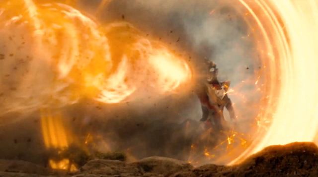 第三个技能是闪光斩。敌人在龙卷的一番折磨后,可以迎接最后一击。 伽马未来泽塔凝聚出一个巨大的光轮,扔向巴罗萨星人。光轮一顿来回斩击后,巴罗萨星人就此爆炸成为漂亮的烟花。