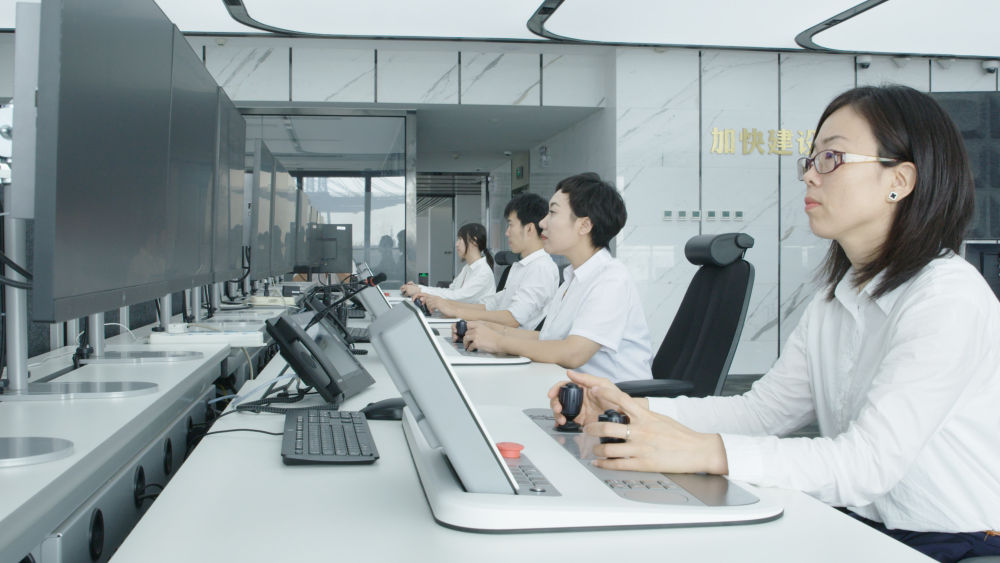 “白领”小丁是“新手”。她坐在四面落地窗户、宽敞舒适的现代化中央控制室里,边盯着高清屏幕,边快速点击鼠标和推动操纵杆,不到两分钟便将一个集装箱精准地吊装到转运卡车上。