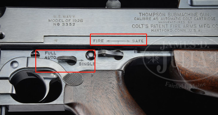 咱们再看点细节。比方下图汤姆逊的快慢机和保险是两套独立开关,而司登没有快慢机,只有全自动。保险也只是把拉机柄挂起...