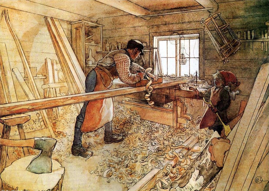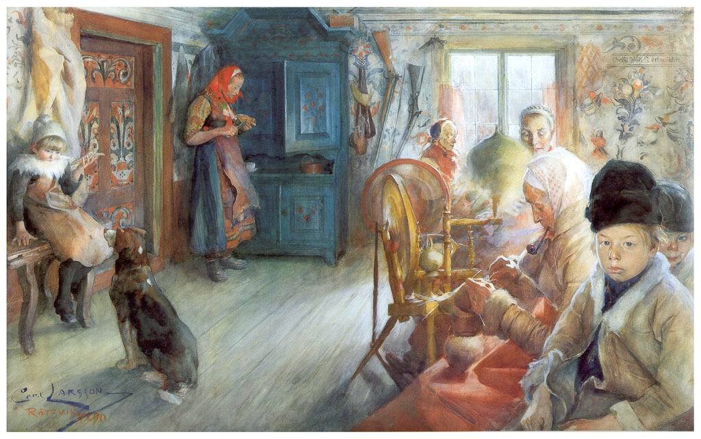 拉森的后半生很有意思,他和妻子卡瑞琳回到瑞典中部乡村小镇桑德波恩,按自己的趣味设计住房,然后生了8个小孩。他画的都是家庭生活趣事,一本又一本。他的这些反映普通生活的画作是他的艺术创作提高到一个新的高峰。