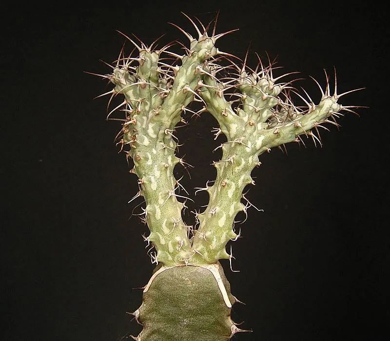 可以说,绝大部分的大戟科植物都可以用来嫁接虎刺梅,包括常见的三角霸王鞭、麒麟掌、白角麒麟和白雀珊瑚等。具体的嫁接方法也非常简单,可以将普通的虎刺梅作为接穗,枝条剪下来底部切出一个V字形,在龙骨的顶端则可以切出一个倒V字形的凹槽。