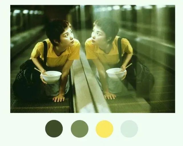 以黄、青为主色调,冷暖搭配,有一种奇异的质感。王菲亮黄色的身影在暗色青绿的背景下,通过冷暖色调的对比,靓丽纯净的似乎要跳脱出画面,小心翼翼中透着遮掩不住的期许,体现出女孩竭力想掩藏却偏偏在不经意中流露出的艳丽纯净。