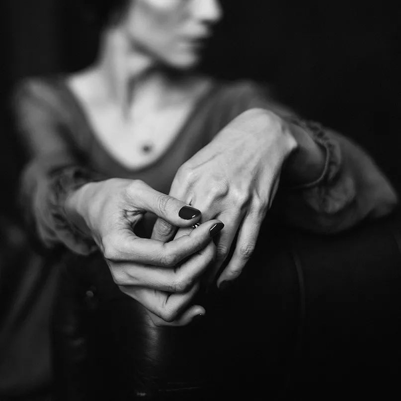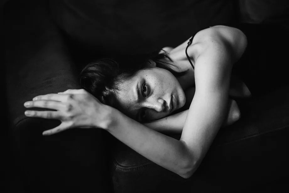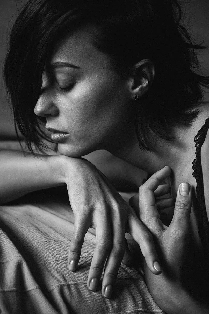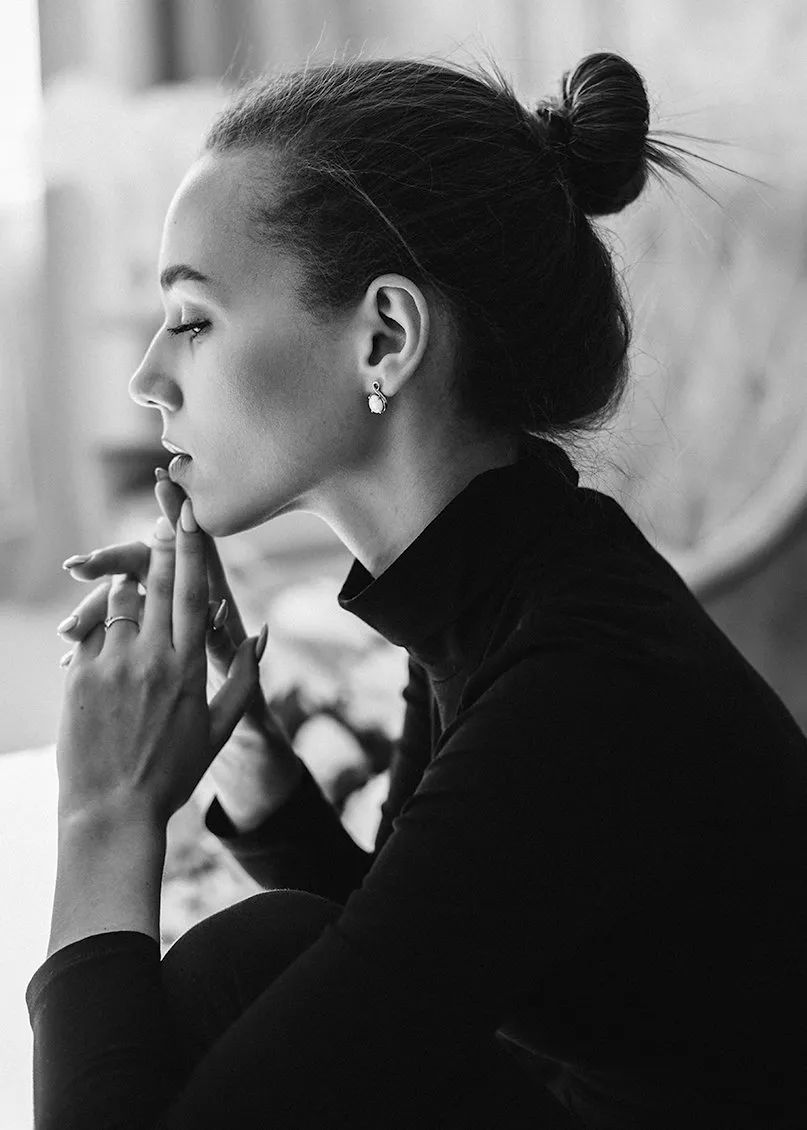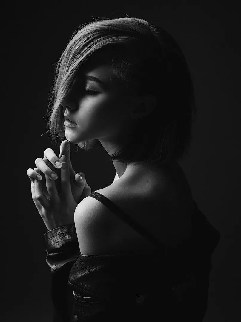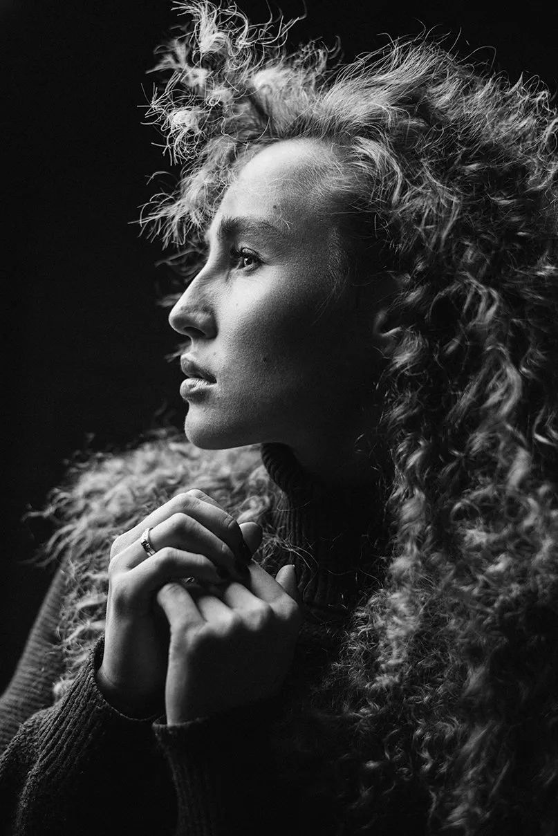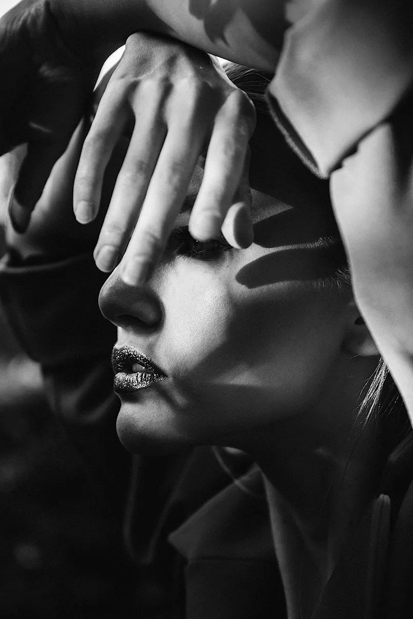 为了让侧颜形成的五官线条更唯美,可以用手微微抵住下巴,从而让肢体线条贯穿整个画面。同时利用手指遮挡住部分光线,还可以在面部形成具有一定艺术感的光影效果。