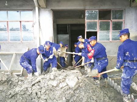 陇南市森林消防支队自8月20日进入文县县城和碧口镇以来,350名消防队员连续奋战在排涝清淤一线,帮助群众恢复生产生活,还积极与当地政府、街道办联系,派出消杀巡诊小分队为受灾群众义务诊疗,同时做好心理疏导工作。 本报通讯员 刘文超 摄(陇南日报)