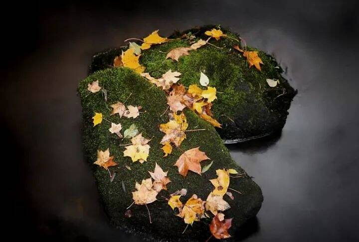 秋天拍水在构图上对环境的考虑是非常重要的,有青苔的地方是非常适合的,青苔的颜色与树叶形成鲜明的对比,更能够表现水的质感