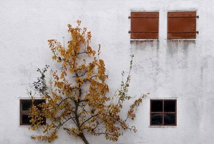 白墙与窗户的本身就是一种构成,结合这棵小树,画面的搭配非常和谐