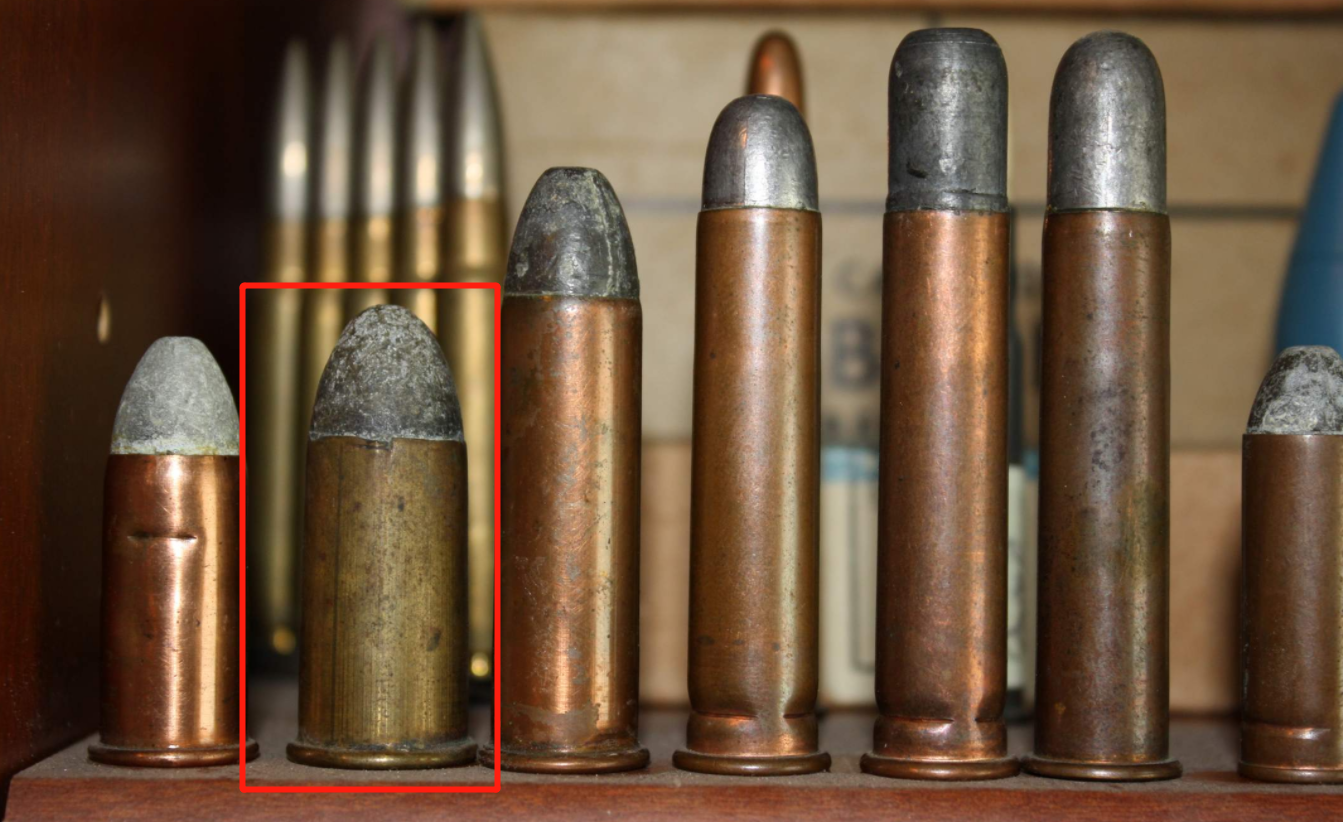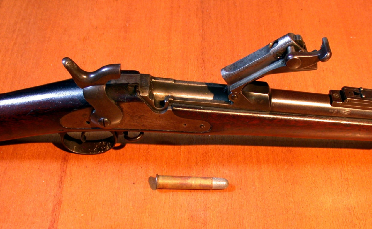 由于后膛步枪存在闭锁不严的问题(相比前装枪而言),因此1865发射的是.58-60-500金属定装的边缘发火弹来解决后膛闭气问题(当时金属定装弹刚开始普及)。这儿我得说下当时美军弹药的命名规则,.58(口径0.58英寸等于14.7mm),60是黑火药装药,单位是格令(60格令=3.89克),500则是弹头质量,单位也是格令(500格令=32.4克)
