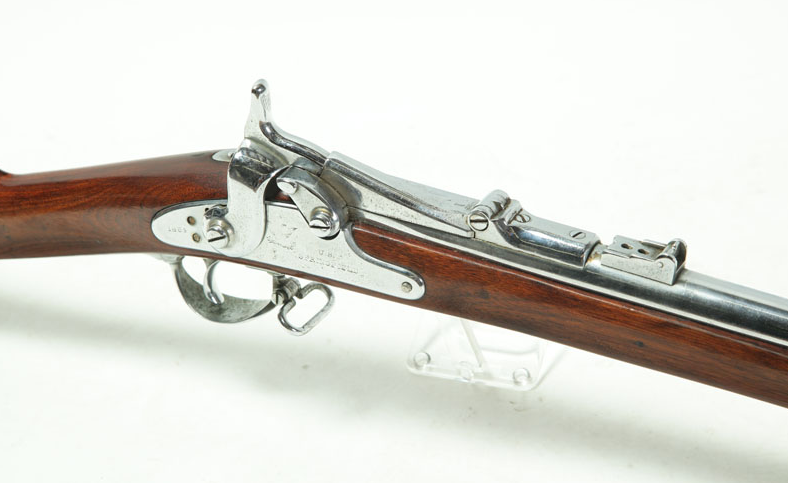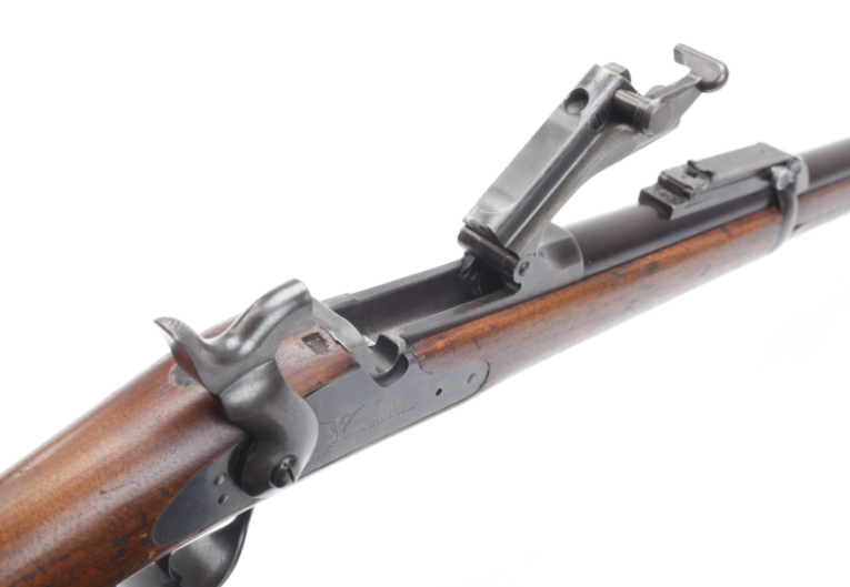 M1865是一种后膛装填的活门步枪,上图处于枪机打开状态。