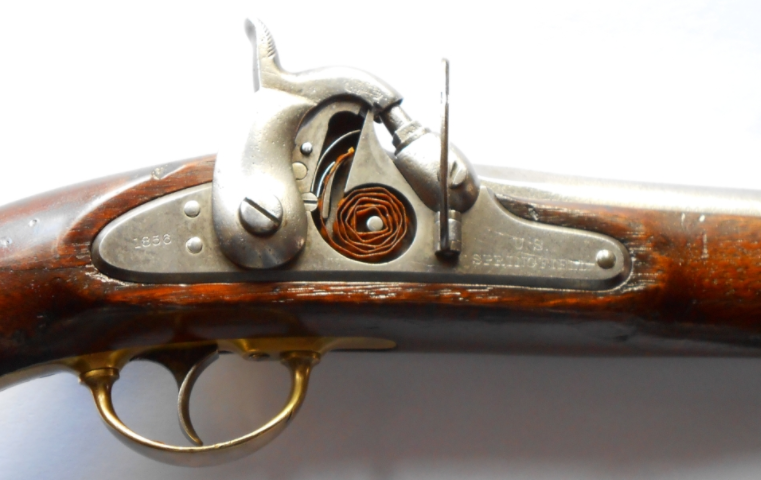 M1855就是一种火帽击发的前装燧发枪,比较特别的地方是它采用了条带式的火帽,拉开击锤的时候自动加载条带上的新火帽。但这个设计并没有节省太多的装填时间(前装步枪本身就够慢),而且条带也不可靠,容易出故障,所以真到打仗时候,春田就不用这个劳什子条带了。改回了早先的单个铜火帽击发,这批简化版被称之为M1861,在1863年,经少量改进而成了M1863型。