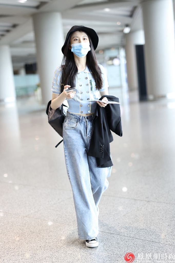 2020年8月31日,张慧雯现身北京机场。 上装:露脐短袖针织衫 下装:阔腿牛仔裤 鞋:Converse帆布鞋 配饰:渔夫帽