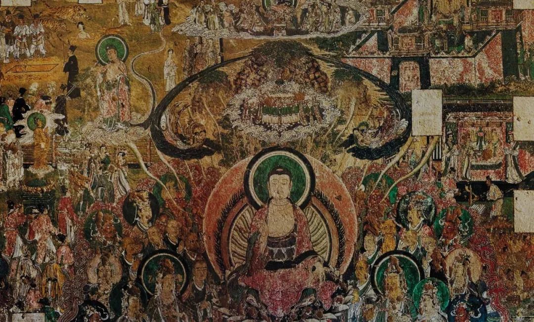 开化寺壁画布局,采用的为左中右式,或左右式。 左右部分又采用连环画形式,表现故事画面内容。 在图与图的分界上,或图案走边,或树木分片,或流云分景。 看上去满目珠玑,密而不乱,繁而不叠,错落有致。 在集中中见变化,变化中求统一。 线描与重彩的融合,相得益彰,形成构图美。