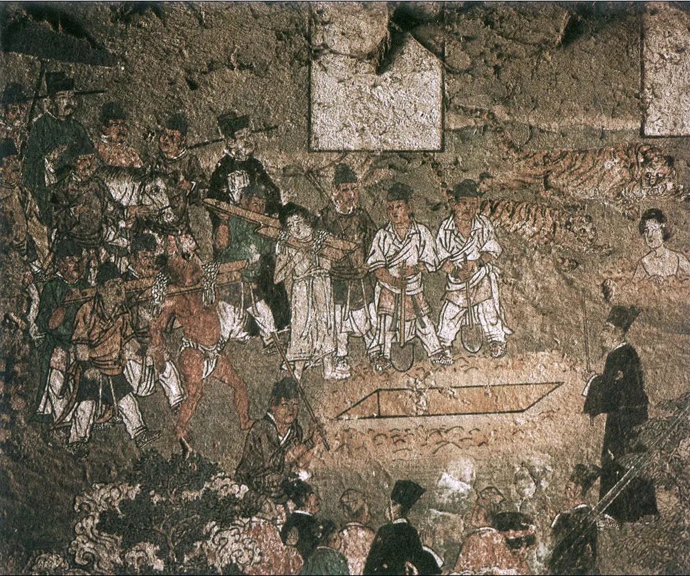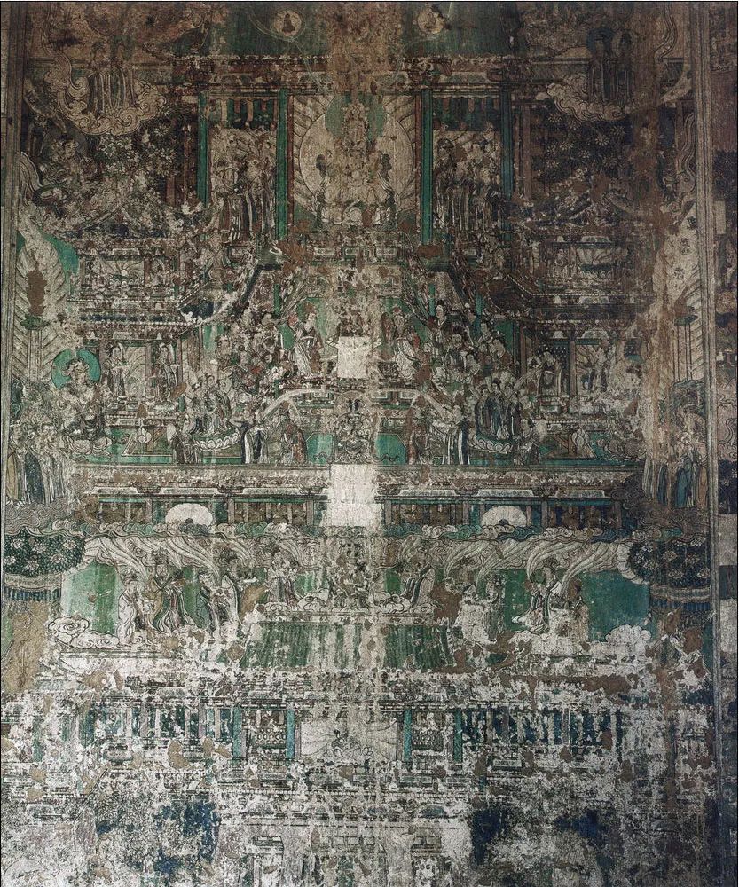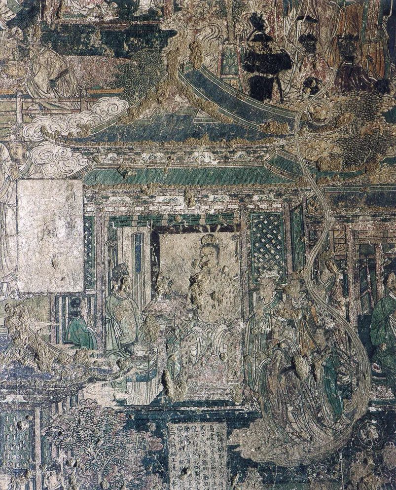 西、北壁作者为谁?经考,发现有画工题记两处:其一,北壁土墙上记:“丙子六月十五日粉此西壁画匠郭发记。”其二,壁内石柱上有:“丙子十月十五日下手扌告(稿)毂立至十一月初六日描讫待来春上采画匠郭发记并照壁。”此两处题记,是证明作者和绘制过程的确凿证据。丙子是宋哲宗三年(1096年),十一月属冬天,指作者完成了壁画之线描稿,1097年上彩。但从榜题(画面文字说明)上看,西壁题完,北壁大部未题,看来是没有最后做完。但郭发,是宫廷画家,还是民间工匠?作画后,有的榜书未题,是被宫廷调走,还是有战乱或天灾人祸?由于其名不见经传,确无从考起。