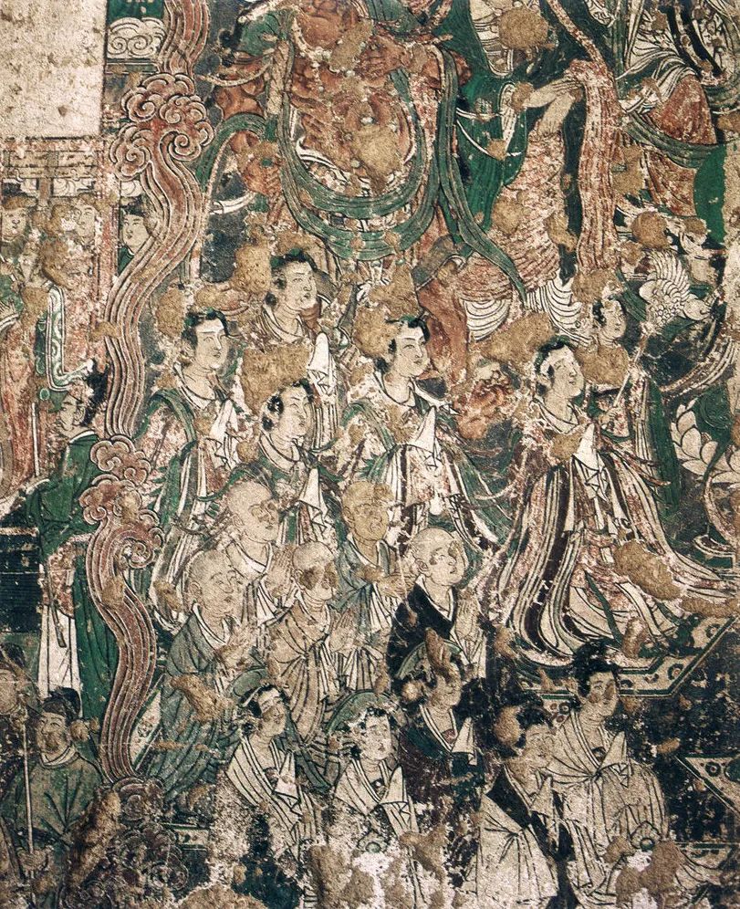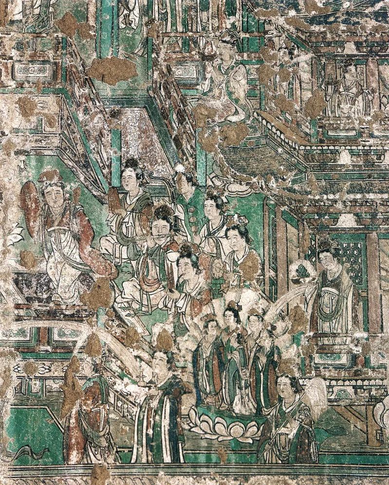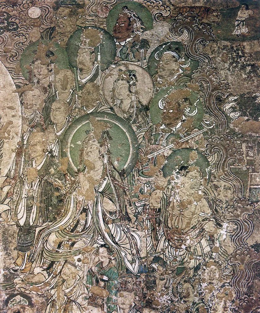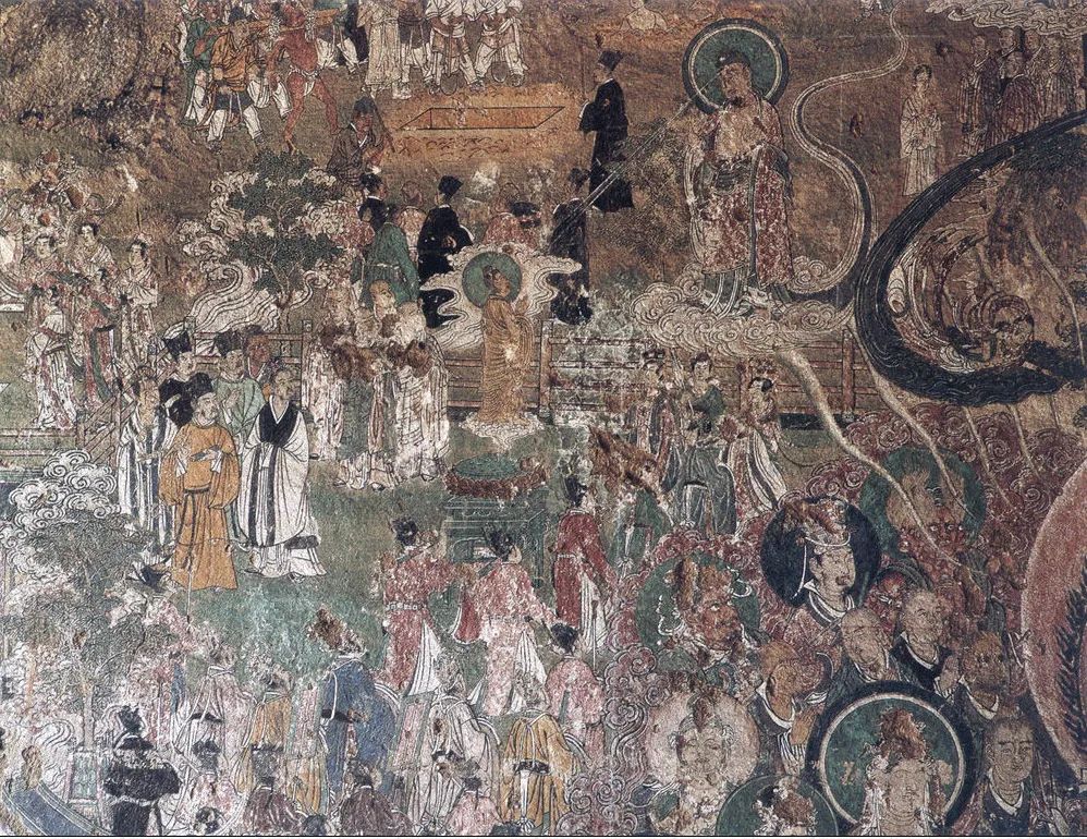 谈及壁画,联系中国绘画史,它有着悠久的历史,确属我国绘画宝库中重要组成部分。这种以线条为主的艺术表现形式和审美意趣的融合,是劳动人民在千百年的历史长河中形成的。唐宋时期,线描人物画发展到了相当高的程度,产生了以阎立本、吴道子、李公麟等众多的名家圣手。此间寺观壁画和石窟壁画异军突起,这与统治者崇尚佛道联系密切。因此,有利于使宗教壁画走向世俗和量变之中,使壁画在艺术领域大放异彩。出现了宏伟壮观的构图与形式,塑造了丰富感人的形象与意境。