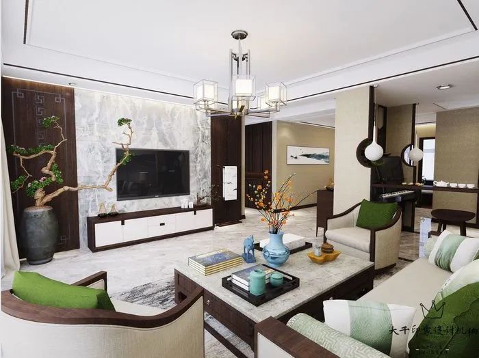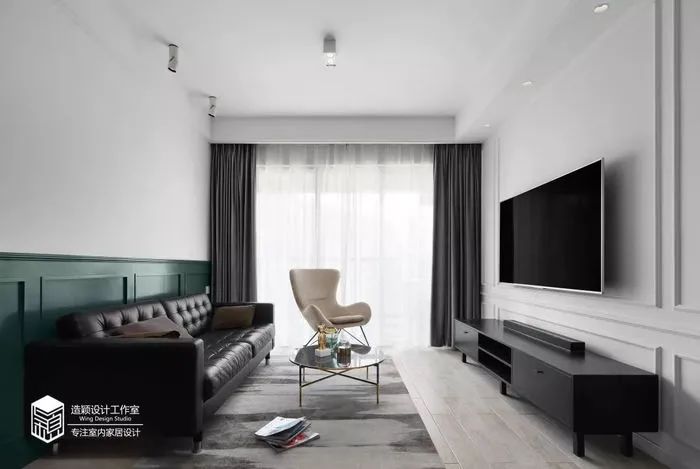 电视背景墙与沙发背景墙相对应,利用墨绿色稍稍加以点缀,竟与线条完美组合。家具的配色优雅而不张扬,高端而不夸张。