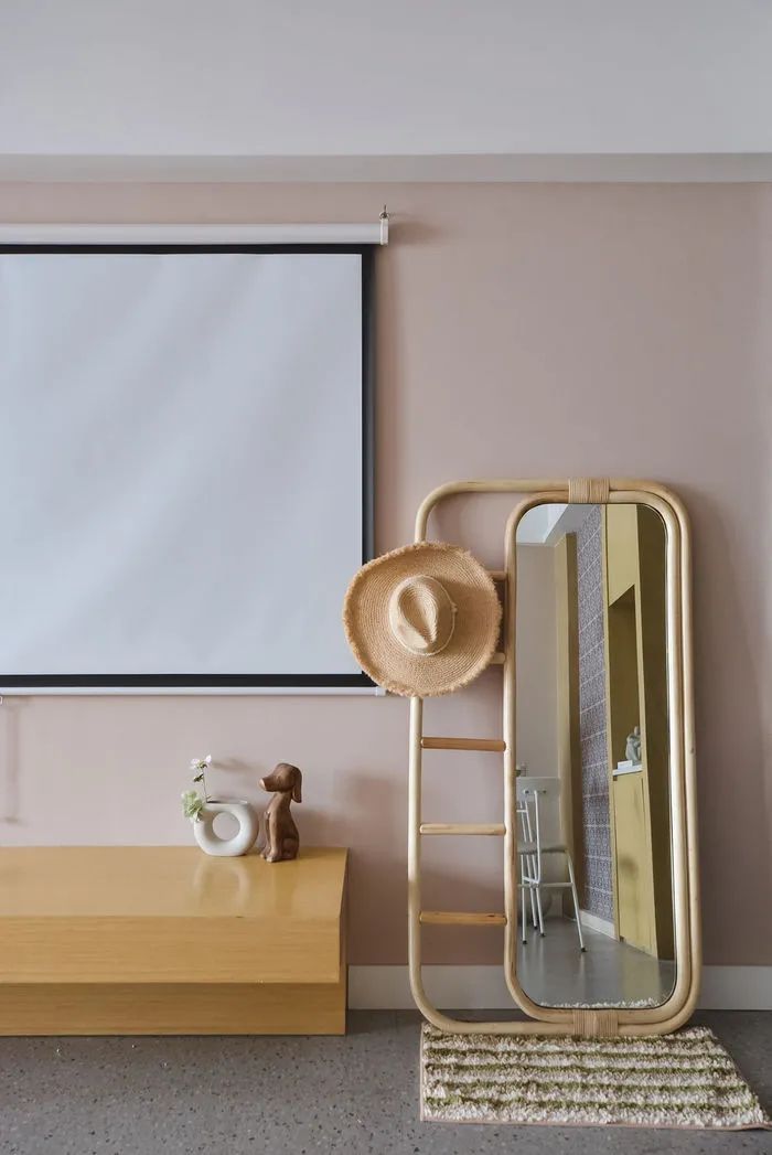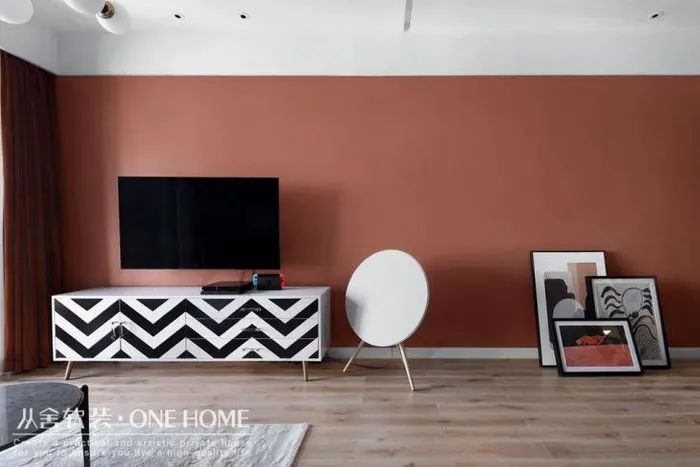 珊瑚红墙面非常有个性,搭配几何图形的黑白电视柜,为整个空间增添艺术质感。偶尔改变一下背景墙,尝试一下珊瑚红墙面,给生活有不一样惊喜。