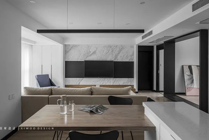 电视墙利用大理石与木材分割错拼,让人眼前一亮,而木材的宽度与电视尺寸大小相符,黑色的门框与背景墙相呼应,与浅色的家具形成了强烈的视觉冲击性,让空间质感更加明显。