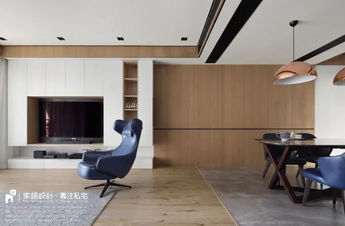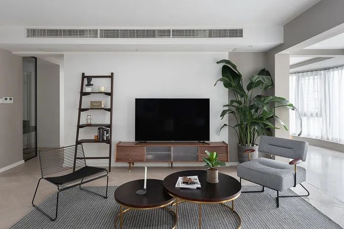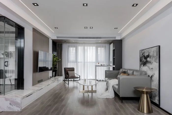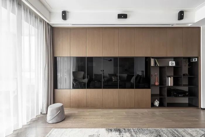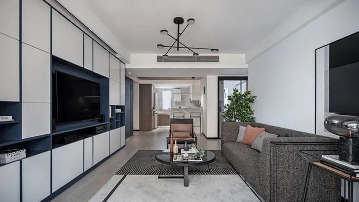 整体色调以黑白为主,底边的原木柔和了黑白之间的色调。整洁的通顶柜电视墙让人看着很舒服,以收纳为主,在灰色低调中显示着简约、自然、轻松的家庭生活。