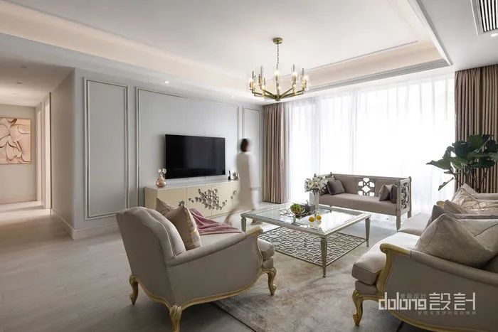 该案例中,除了背景墙用了石膏线,其他墙面也做了线条,墙面线条具有线条美,不仅将墙面拉伸,同时也让整个背景墙显得不那么单调。