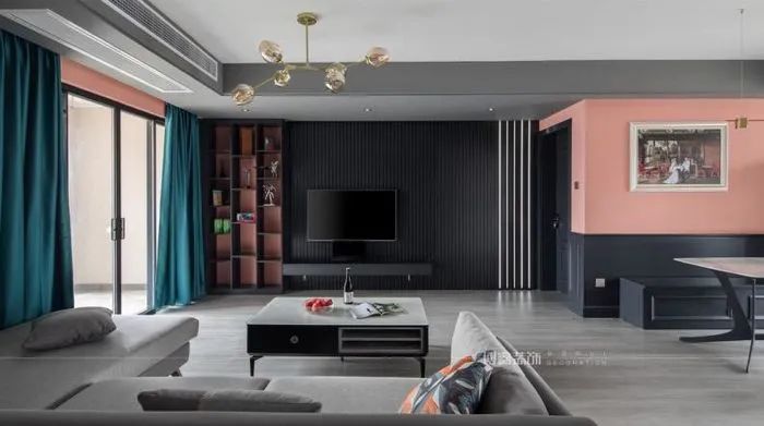 该案例中,整体是黑色与粉色相间,视觉冲击感很强烈。黑色背景墙,并没有像普通的背景墙一样具有对称性,而是左边作书架,书架靠墙一面是与墙面一致的粉色,右边留白,设计很大胆且新颖独特。
