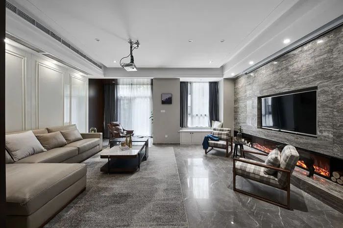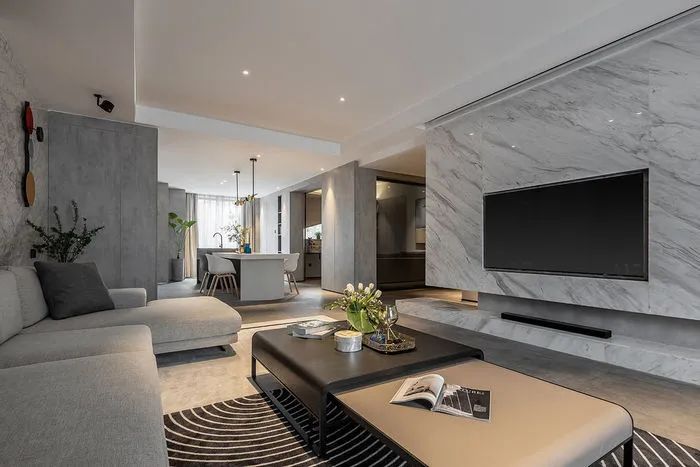电视嵌入进大面积的深灰色背景墙之中,感觉空间档次瞬间上升了好几个level吧?地板色与墙面大理石保持了统一,为避免大面积的深灰色让空间少了温馨,所以需要其他亮色系软装家视来提升亮度,并做装饰点缀。