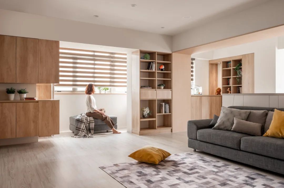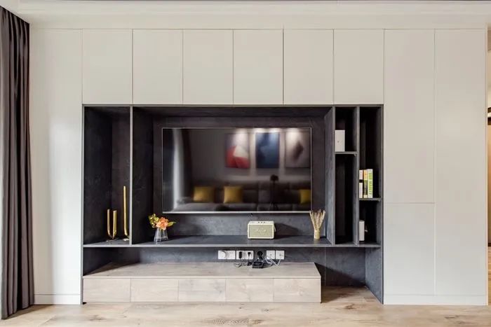 嵌入式背景墙,让空间更宽阔。而且案例中的空间给人一种矮小拥挤的感觉,但背景墙的竖纹让偏矮的客厅有拉高的视觉效果。上面一层当置物架,可以放一些装饰品,简单的背景墙也多了一点艺术的气息呢。