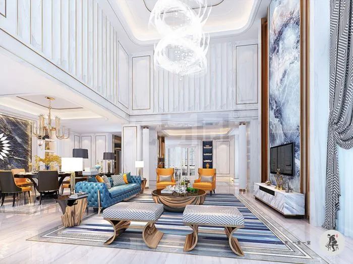 该案例中,中空式的客厅就很适合欧美风格,亮堂的厅室配上美式家具,整个客厅墙面铺上了大理石,其他空白的墙面用金色与石膏线装饰,尽显奢华大气。