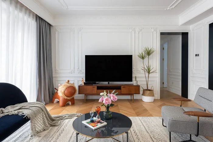 没有复杂的图案,只是简单的框线结构,就将普通的大白墙变成精致的石膏线背景墙,再搭配上复古家具,显得具有别致的风情意味。