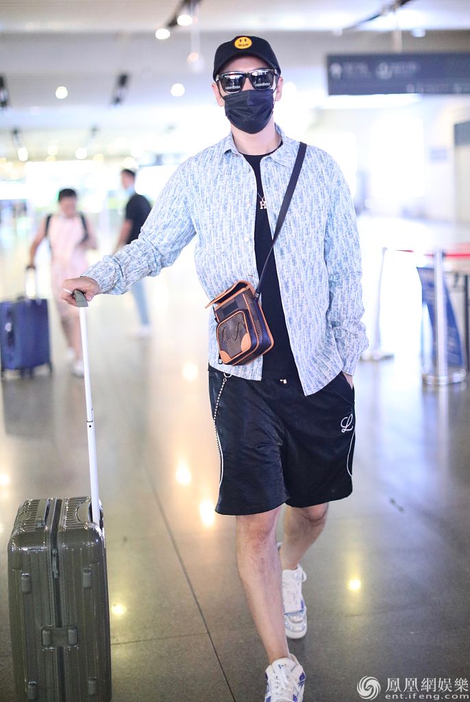 浪姐成团夜!黄晓明黑超遮面穿衬衣短裤 一路自推行李箱酷翻天