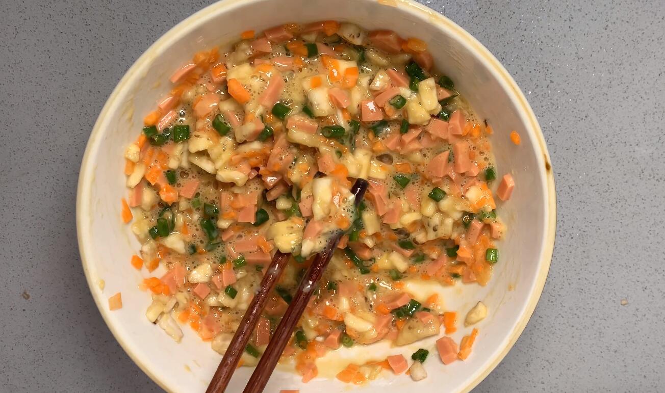 2、先调制一下馅料,准备一个大碗,碗中加入切好的火腿肠、胡萝卜、葱花、茄子丁,再打入2个鸡蛋,搅拌均匀后开始调味,加入适量食盐、生抽、淀粉,再次搅拌均匀,馅料就调制好了,放置一旁备用;