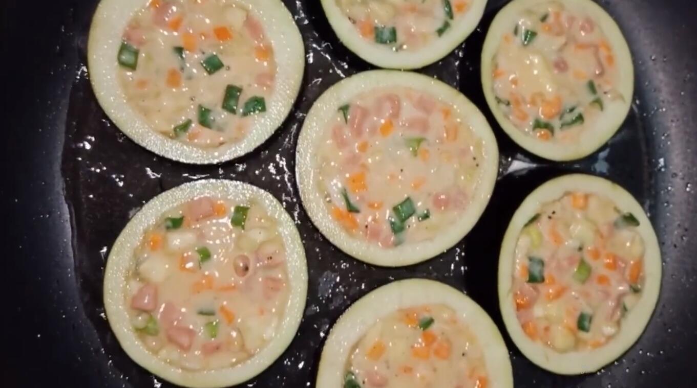 3、起锅,锅中倒入适量食用油,油热后转小火,然后依次放入茄子圈,然后取适量调制好的馅料放进茄子圈里面,并把馅料摊平,全部放进馅料后盖上锅盖焖煮2分钟;