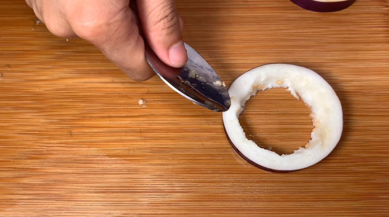 1、准备一根较直的茄子,洗净后切掉头尾,然后再切成1cm左右厚度的薄片,全部切好之后放入清水中,倒入少量白醋浸泡,防止茄子氧化变黑;将其他所需食材准备好并清洗干净,半根胡萝卜去掉外皮后先切成薄片再切成小丁,一根火腿肠也切成小丁,小葱切成葱花;将浸泡好的茄子用勺子挖掉中间的瓤,然后将茄子瓤切成小丁备用;