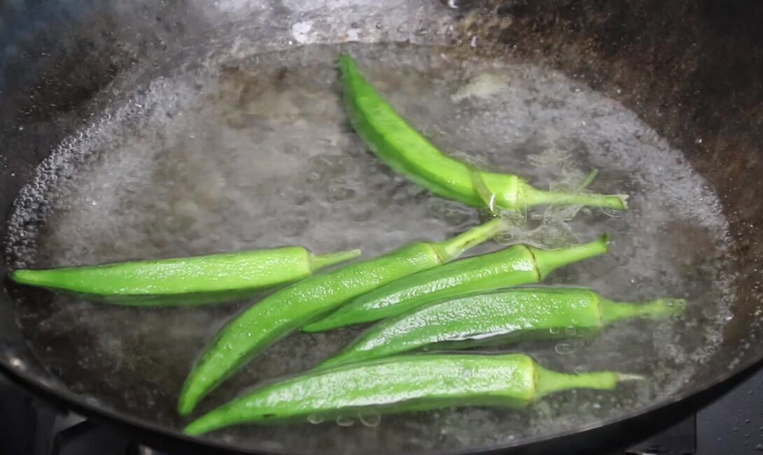 1、起锅,锅中倒入适量清水,开大火煮开后倒入适量食用油,然后下入洗净的秋葵焯水30s,30s后待秋葵颜色变深,将秋葵捞出立刻放入冷水中过凉,保持秋葵的翠绿;