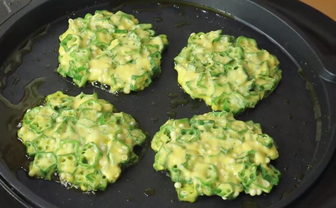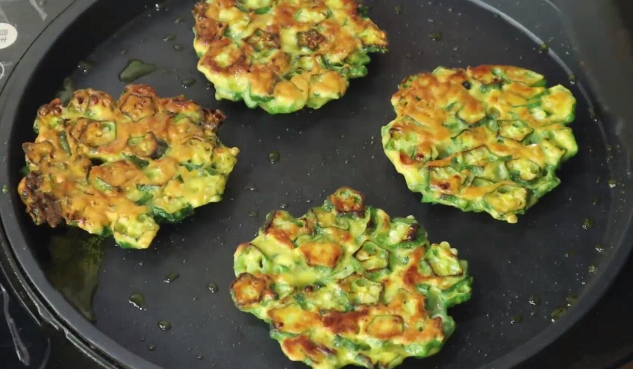 4、3分钟后打开锅盖,秋葵饼的一面已经煎至金黄,翻个面继续煎制,盖上锅盖继续煎2分钟,2分钟后两面都煎至金黄,就可以关火出锅了,盛入盘中,这道简单的秋葵饼就做好了,吃起来脆爽清香,营养又好吃。