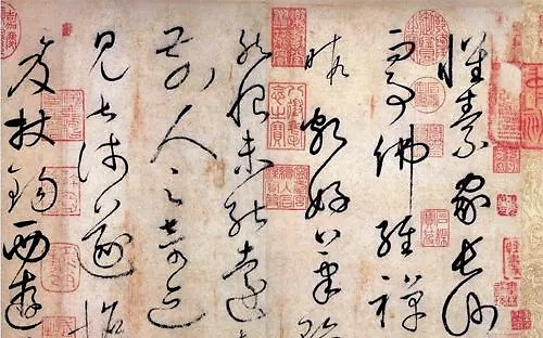在怀素《自叙帖》中,有一些如急风骤雨般的连绵线条,但在线条中某一段会有一个停顿的现象,而且这个停顿出乎人的意料之外,也就是说:它在你的预期中是不会停止的,或者说它在这个地方没有理由停顿,但事实上出现了停顿的现象,我们称为“嘎然而止”。