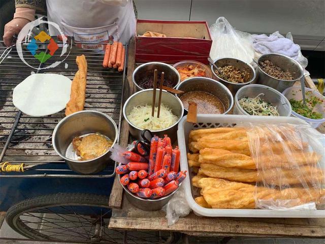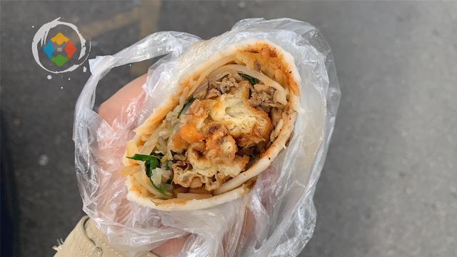 将饵块放置在炭火上炙烤,搭配特制的酱料,裹上油条等配菜,比肉夹馍、煎饼果子还要丰富,也是别有一番风味了。