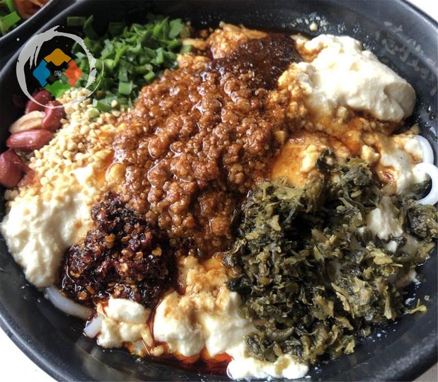 米粉用水煮好后放凉,装在碗中,再舀上一大勺豆花铺在上面,加入肉酱、花生、咸菜、辣椒等调料和配菜,就做好了。