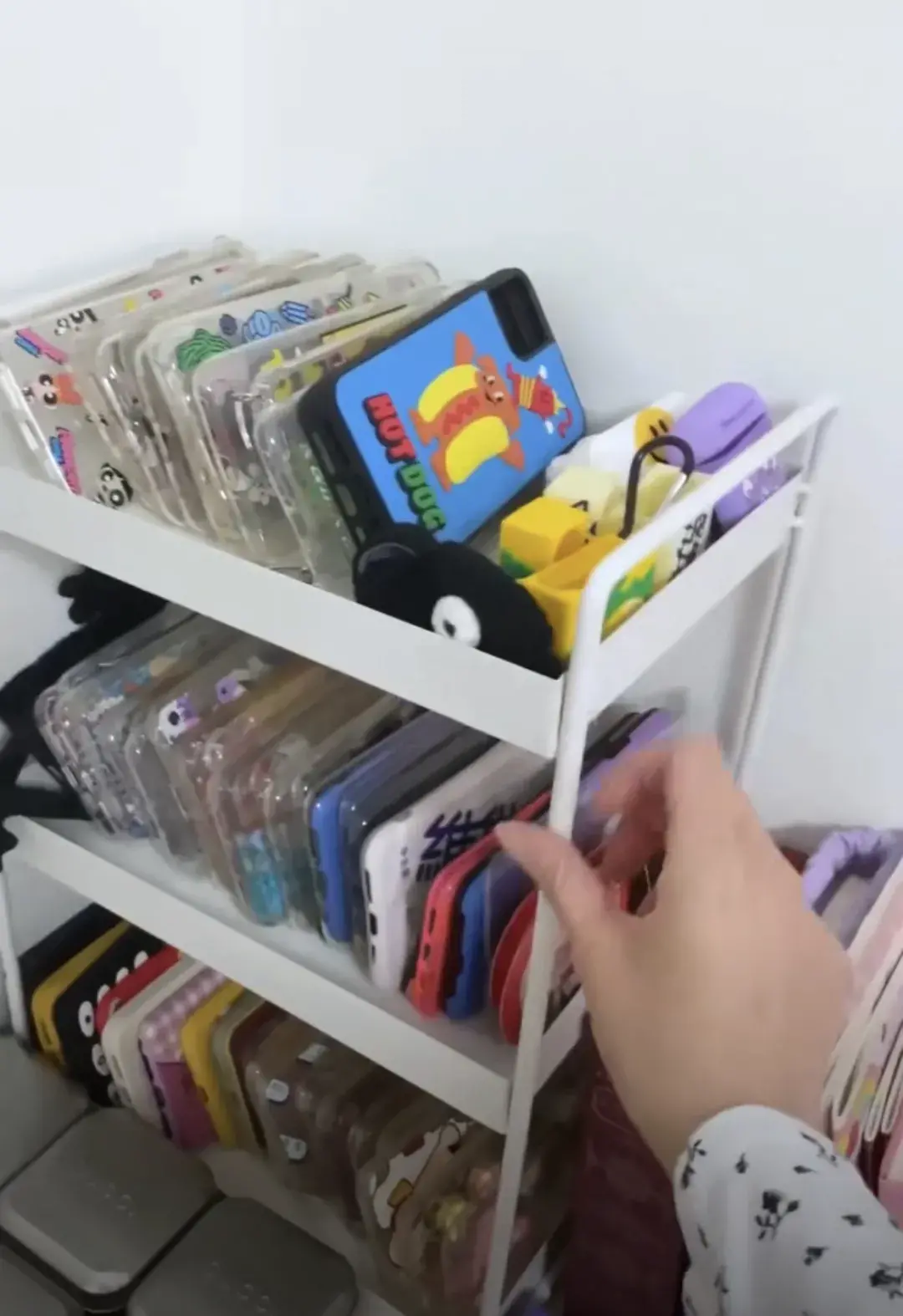 入手各种漂亮的手机壳就是女明星爱干的一件事了,宋妍霏的手机壳就多到得专门用个小架子来存放。