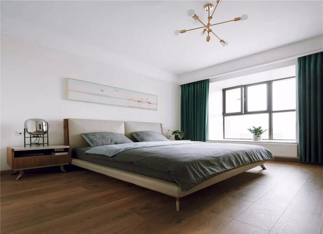 简雅色调的卧室,搭配床头墙上的一幅火烈鸟装饰画,再布置上舒适的皮艺床和灰色的软装用品,沉稳大气。搭配上墨绿色的窗帘,让空间简约舒适的同时还有档次。