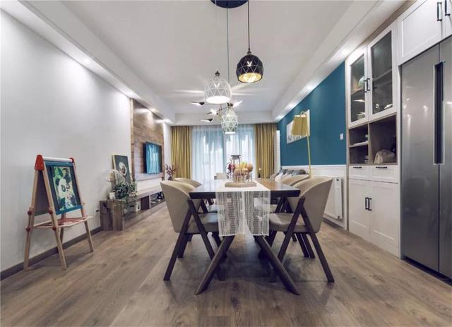 餐厅侧边的墙面定制了一个入墙式的餐边柜,同时冰箱也嵌入到里面,这样不仅节约空间不浪费,还提升了简洁自然的空间感,布置上胡桃木的餐桌,皮艺坐垫的餐椅,让用餐体验精致舒适而端庄大气。看向餐桌一边的墙面上,九宫格鸟儿装饰画,黑白蓝的创意吊灯,也让餐厅显得更加精致活泼且有趣。