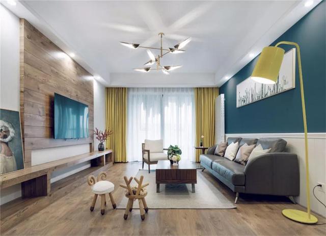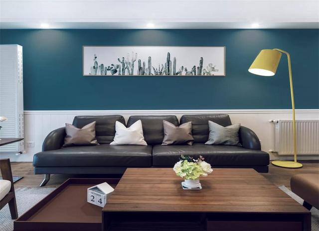 沙发墙以护墙板为墙脚,墙身刷成蓝色的乳胶漆,挂上一幅仙人掌的横幅装饰画,搭配黑色皮沙发,再融入黄色落地灯,布置出一种活力简约的档次感。
