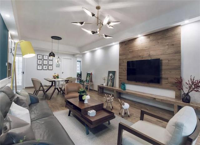 客厅一旁摆上两张可爱的绵羊与鹿角造型的小孩座椅,茶几区域铺设舒适的地毯,让空间显得温馨舒适而富有童趣性。电视墙在木质背景的基础,电视柜是一个大板的木质定制,还摆上了精致餐椅的小饰品,让空间视觉显得自然也有和谐大气。