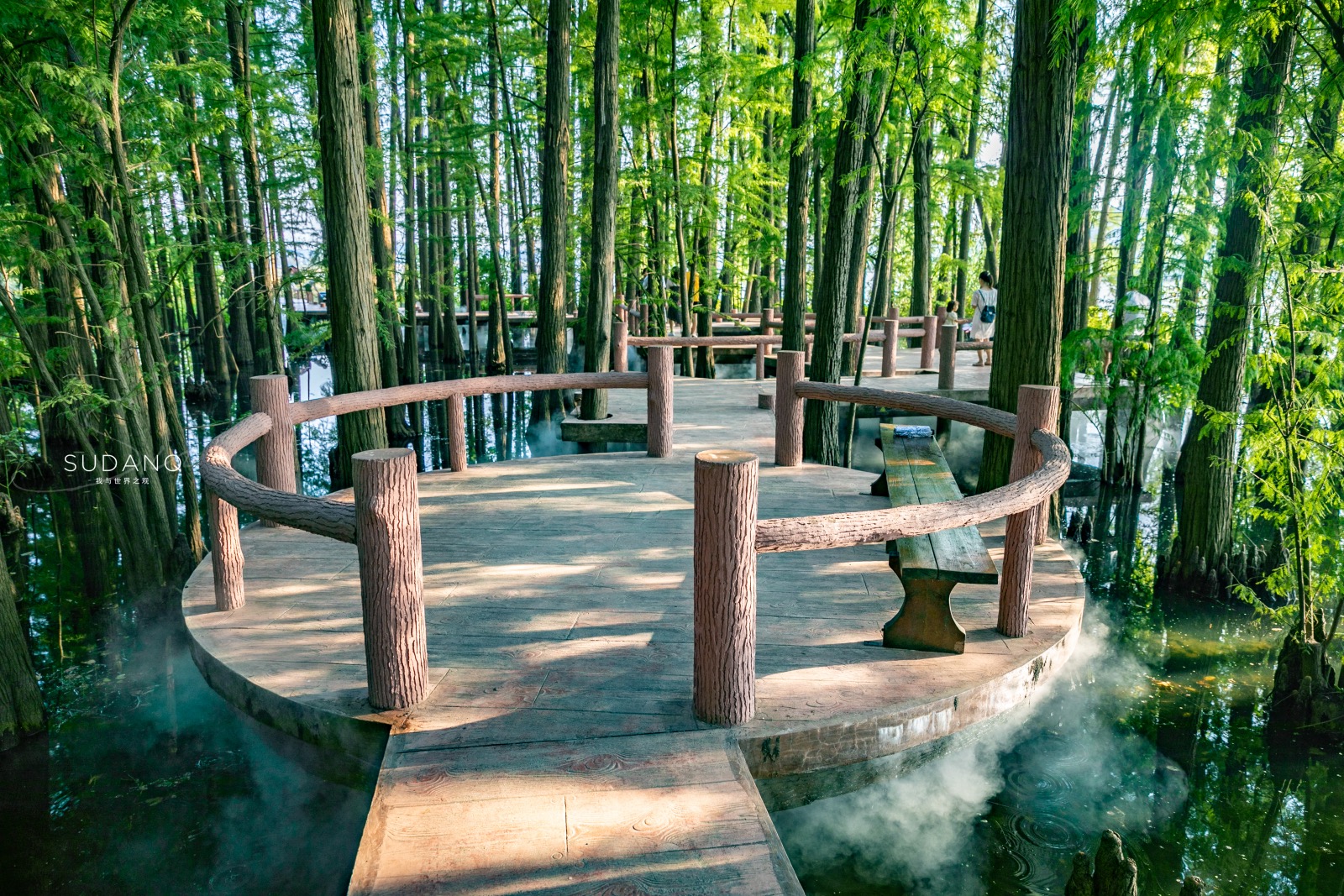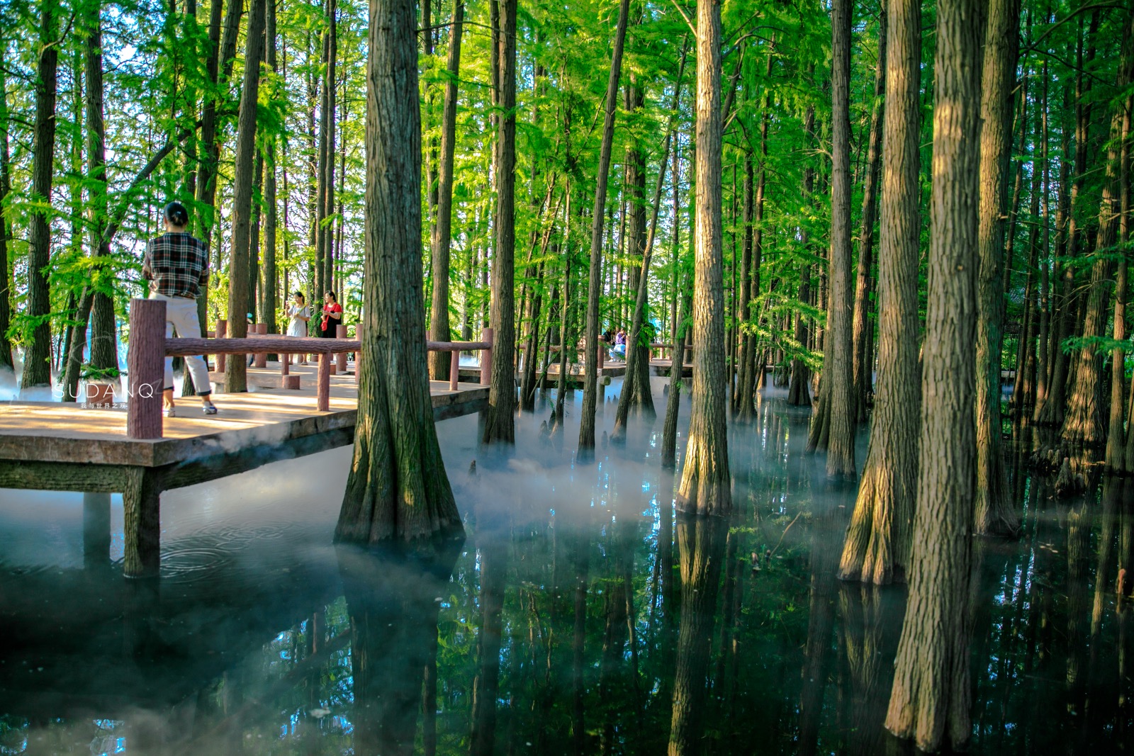 这道新晋网红景点吸引了无数武汉市民前来打卡、观光,桥间的池杉林井然纵横,与亭亭倒影相互辉映,桥面水雾缭绕,犹如人间仙境,拍照打卡的游客络绎不绝(每天9点至17点每隔10秒就会喷出水雾)。