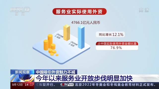 值得关注的是,今年前八个月,服务业新设外商投资企业20079家,占全国新设外商投资企业数量比重为88.8%;服务业实际使用外资4766.1亿元人民币,同比增长12.1%,占中国实际使用外资金额比重为76.9%。服务业开放步伐明显加快,稳外资作用显著。