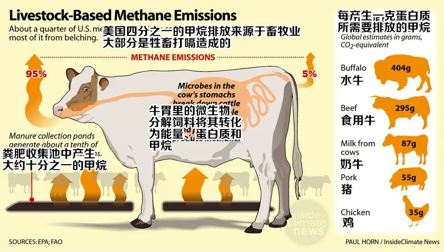 畜牧业还会产生大量温室气体,全球15亿头牛一年打嗝和放屁所产生的废气(主要是甲烷),影响甚至超过汽车、飞机等交通工具排放的二氧化碳总量,成为全球温室气体第三大排放来源。