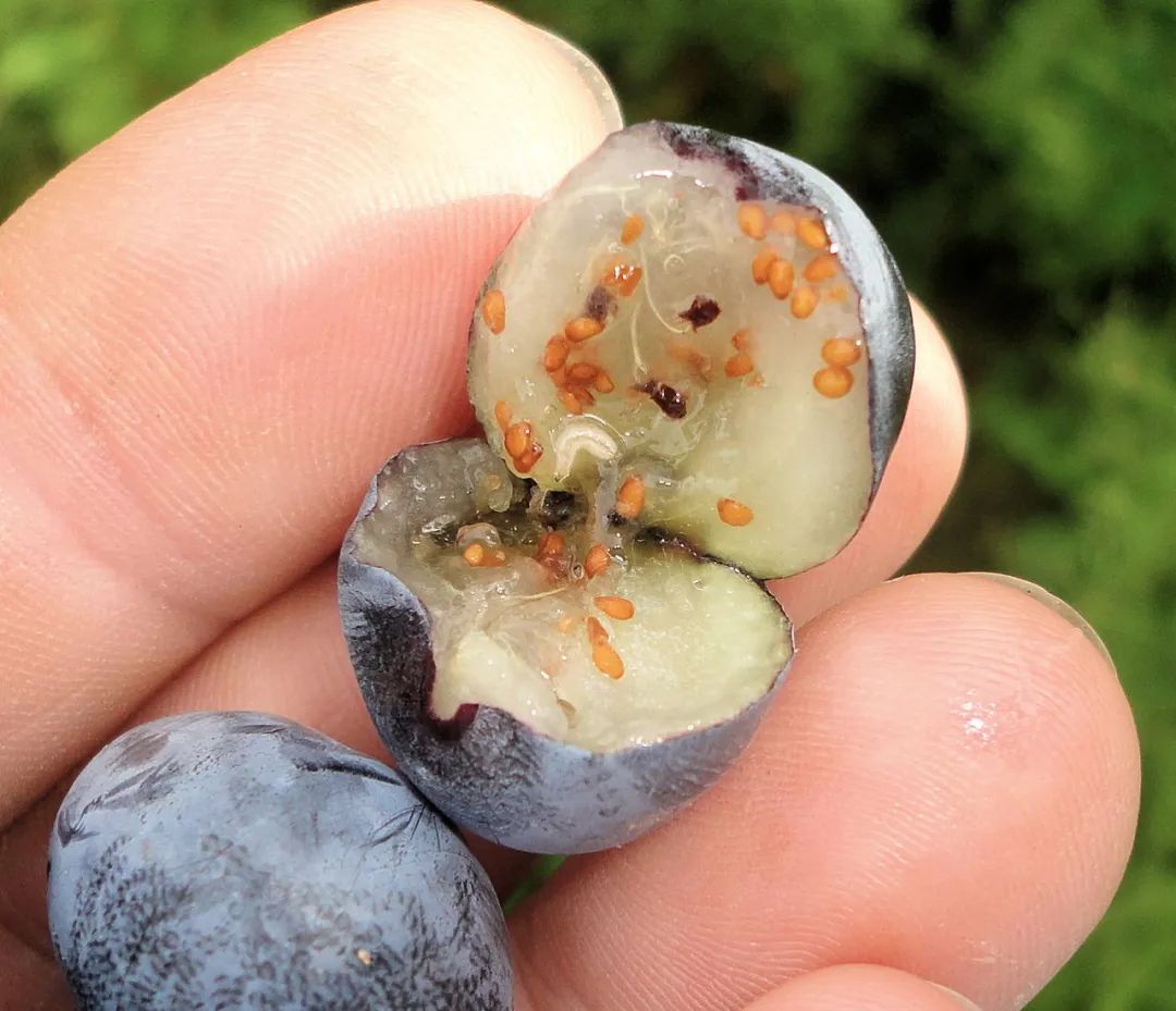 现摘现吃的蓝莓园里,随手掰开一颗,肉眼可见的小白虫也是一等一的新鲜。