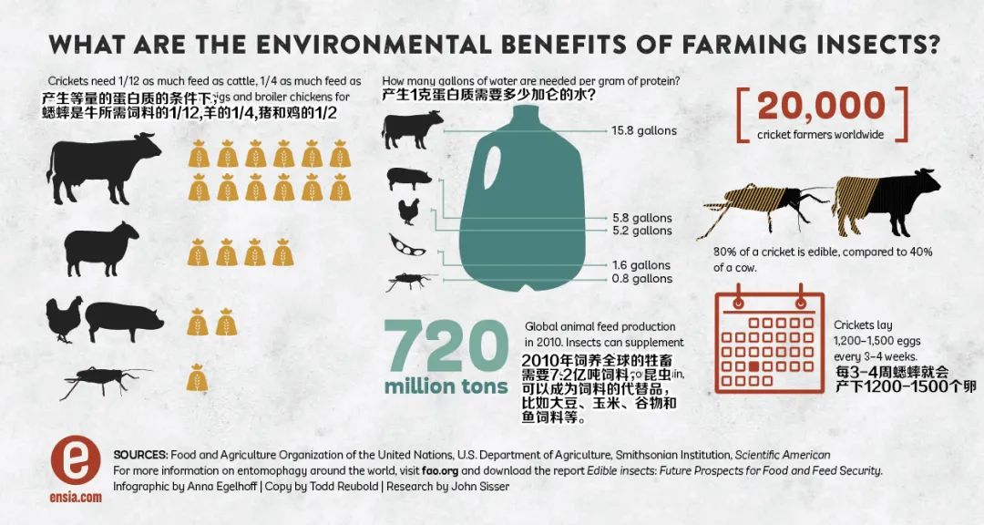 从蛋白质转化率来看,产生相同数量蛋白质,昆虫所需的耕地面积是牛牧场的1/8,所需的水资源只有牛的1/15,温室气体排放至少可减少到原来的1/6。