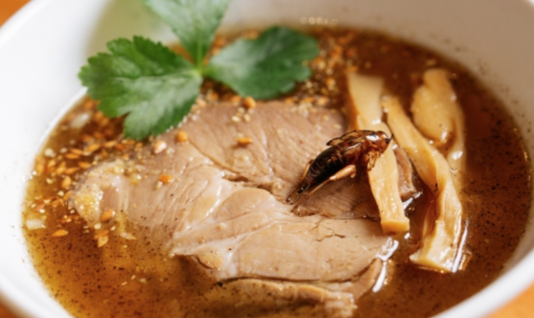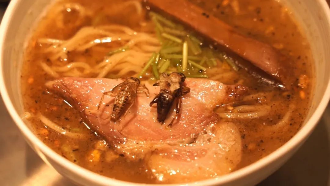 日本网红餐厅Antcicada的招牌就是蟋蟀拉面,端上来就能看到,烧肉上趴着一只完整的油炸蟋蟀,可是其实每碗面里有100只蟋蟀。