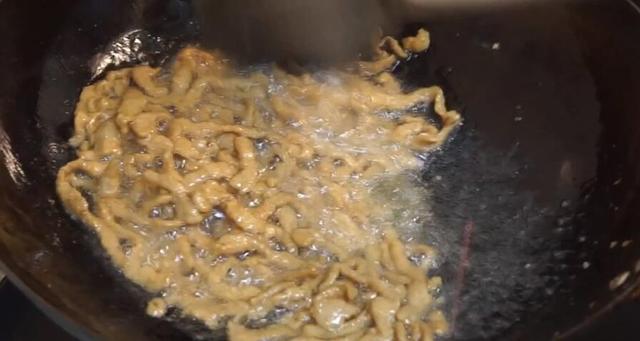 4、再次起锅,锅中倒入适量食用油,油温6成热后加入腌制好的肉丝滑炒,肉丝炒至完全变色后控油盛出备用;